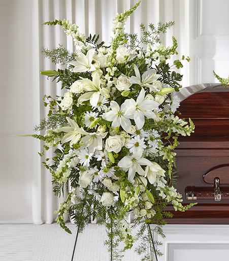 During times of sensitivity, it can be difficult to communicate the right message. However, our Loving Thoughts Standing Spray provides a beautiful way to convey your sentiments. This arrangement includes elegant white and ivory flowers such as lilies, roses, and snapdragons, making it an ideal way to demonstrate your reverence.