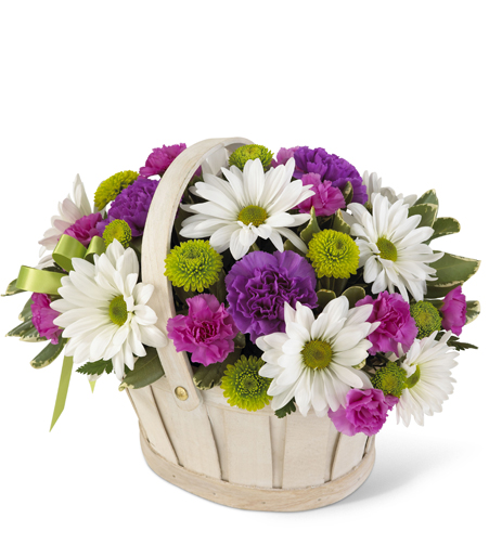 This bouquet of purple flowers is both simple and elegant, with a basket and ribbon that perfectly complement the blooms. Our local florist will present the anniversary bouquet in a handled, whitewashed basket, featuring white daisies, hot pink mini carnations, purple carnations, and green button pompons, topped off with a lavender ribbon. With same-day delivery available, it has never been easier to celebrate your love and the journey you have been on together.