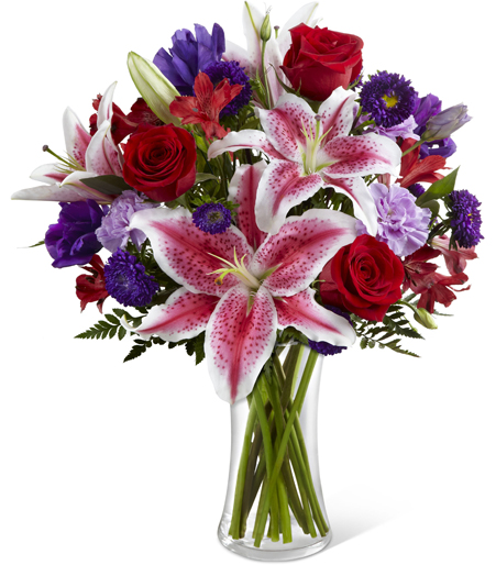 Celebrating special days and reveling in them adds to their significance and beauty. Whether it's your wedding anniversary, first encounter anniversary, proposal anniversary, or any other day to express love to your partner, seize the opportunity! Small gestures keep the magic of a relationship alive, and there's no age limit to being romantic. Flowers are a sweet way to express love, and the Stunning Beauty Bouquet is a perfect choice. This arrangement of vibrant flowers exudes joy and happiness, with lavender carnations, red roses, purple double lisianthus, red Peruvian lilies, and purple Matsumoto asters, surrounded by double-toned Stargazer lilies in an elegant glass vase. Even if you're away on your anniversary, we've got your back with same-day delivery and the option to add balloons. Make the occasion unforgettable!